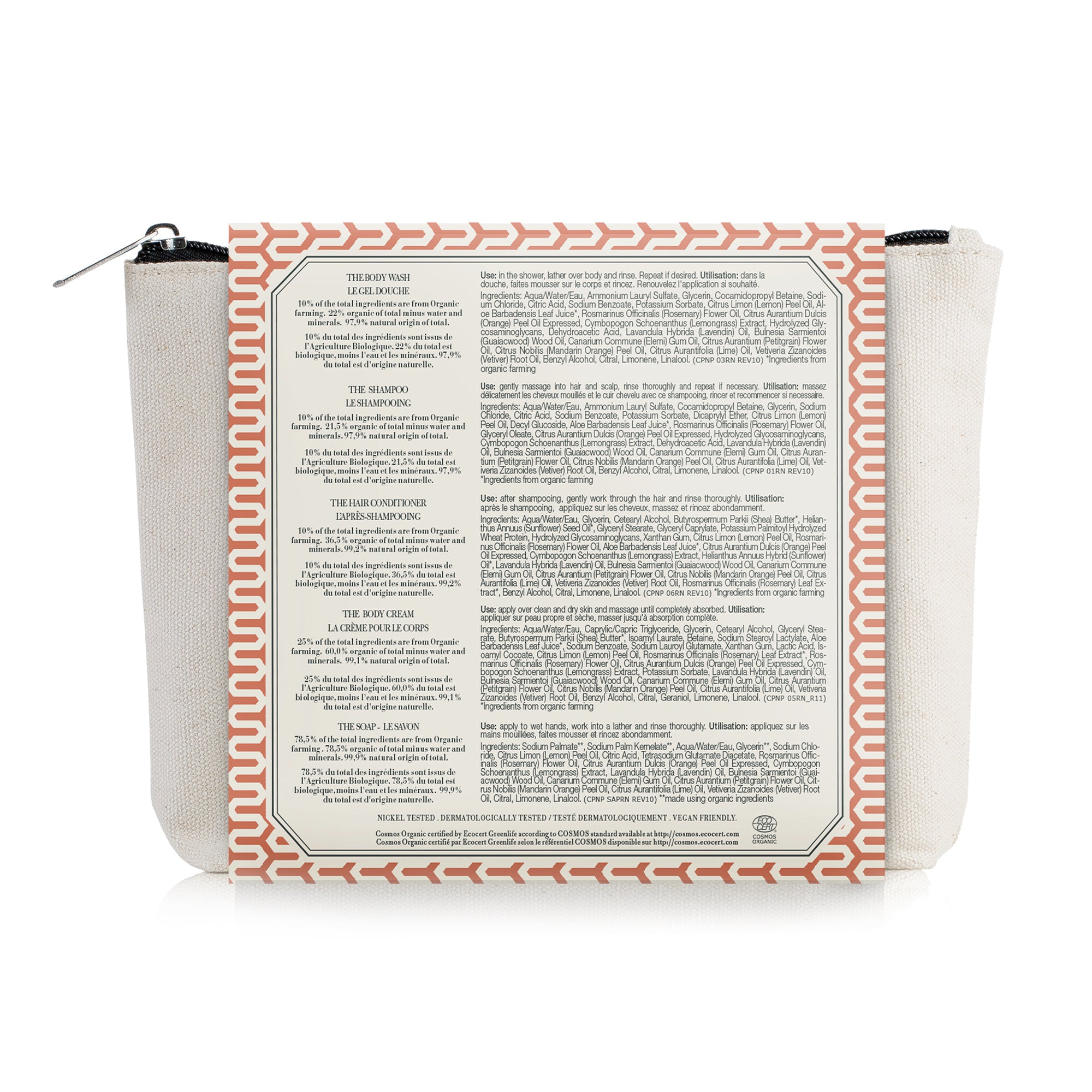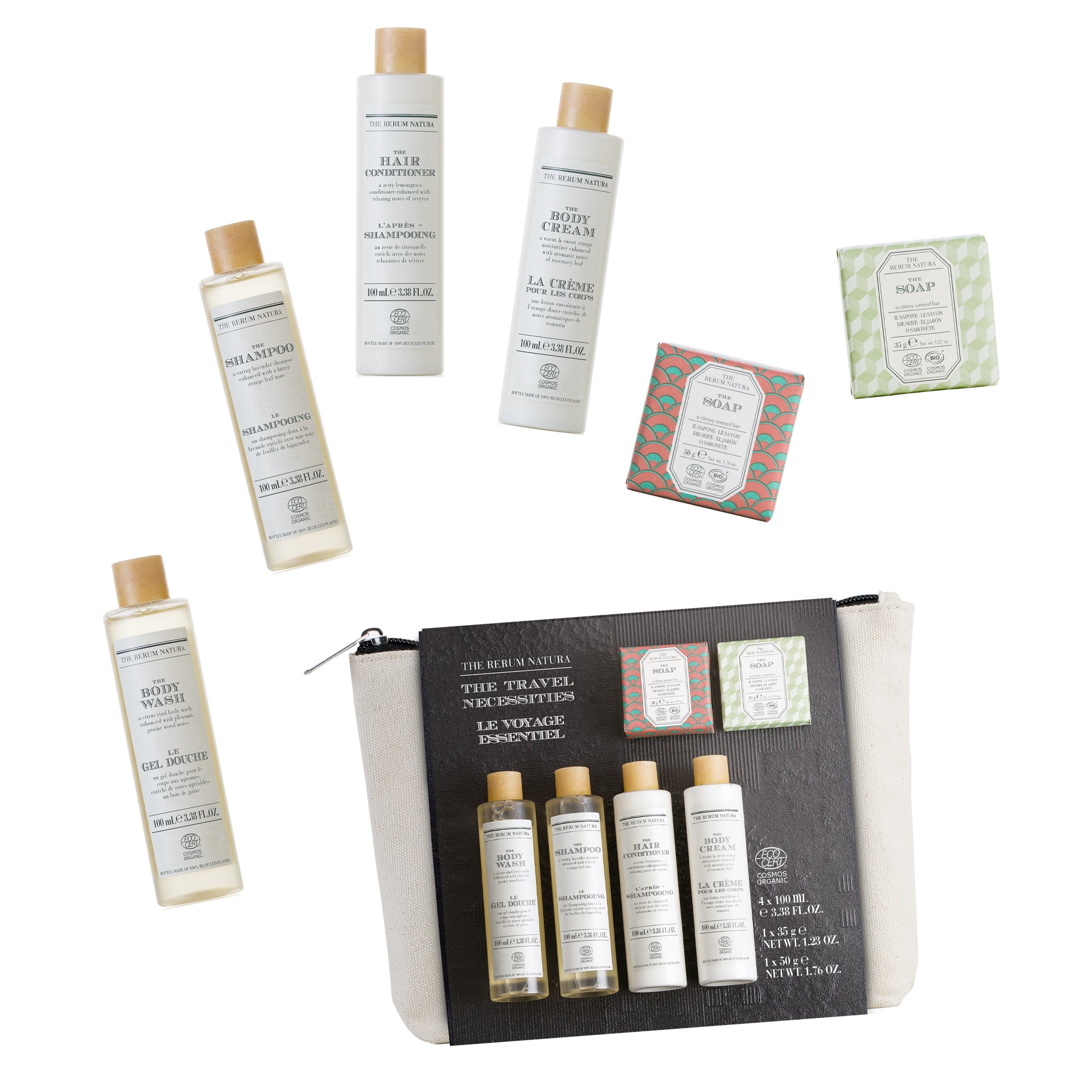 Carry on kit for your hair & body care. The pouch contains all your necessities for a short travel. Production: Cosmetics and paper band are produced entirely in Italy, pochette...