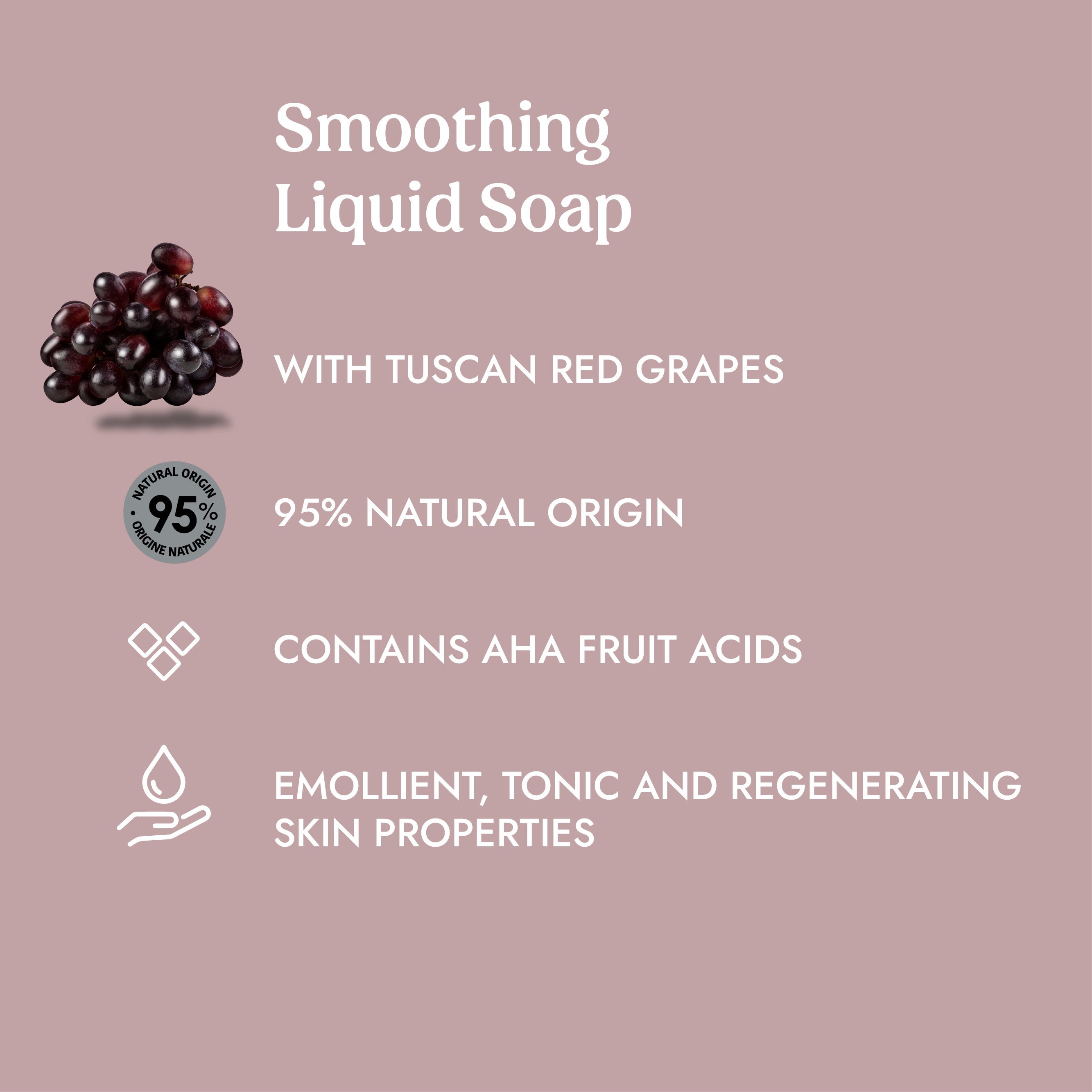 De los viñedos de las colinas toscanas proceden las uvas rojas cuyos extractos se unen a las manzanas del Trentino, los limones de la costa amalfitana y el salvado de trigo del valle del Po. Estos ingredientes son conocidos por sus propiedades emolientes, tónicas y regeneradoras de la piel, que enriquecen aún más el Jabón Líquido con uvas rojas de la Toscana.