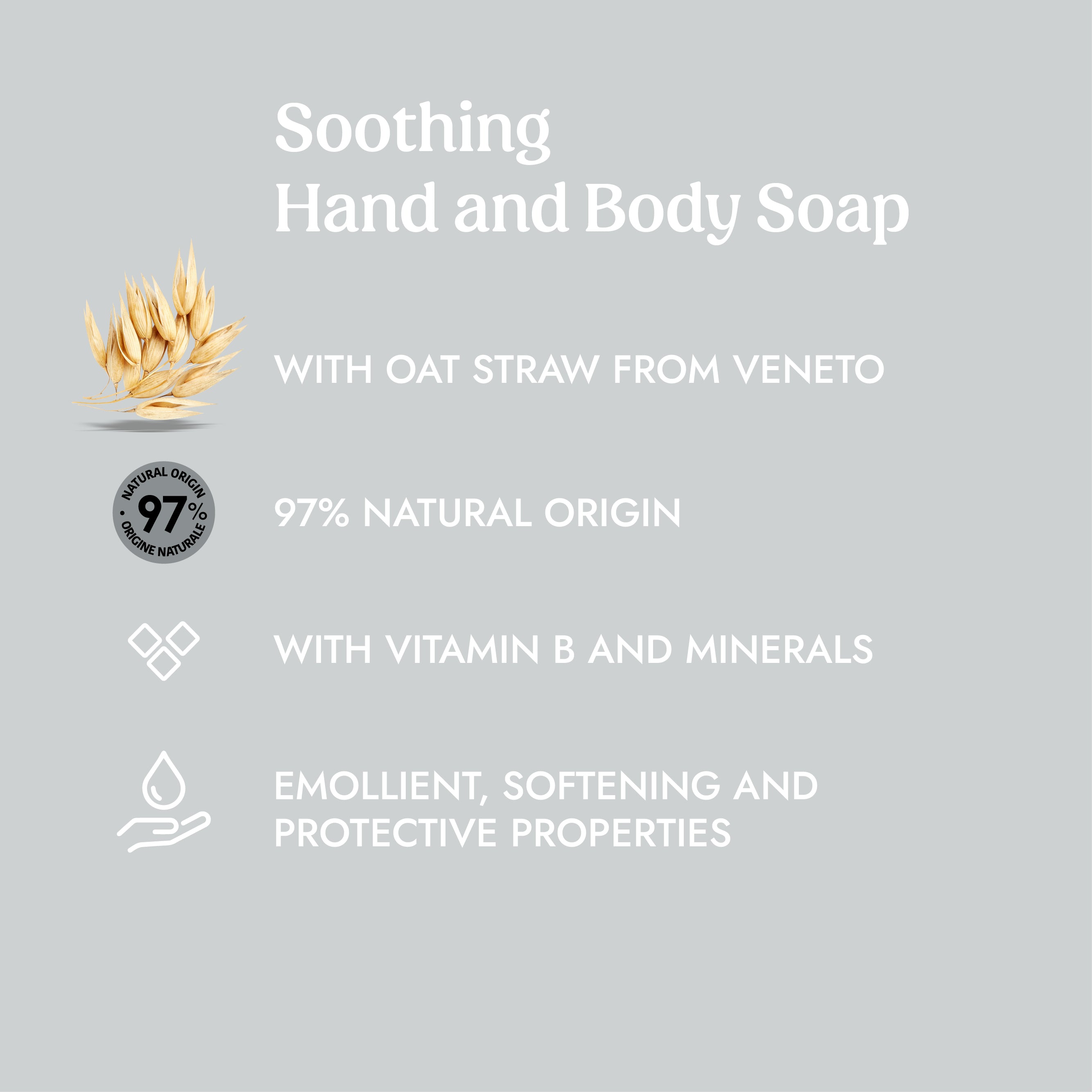 El Jabón de Manos y Cuerpo con paja de avena del Véneto, de origen exclusivamente vegetal, contiene un 97% de ingredientes naturales. Está enriquecido con glicerina vegetal para garantizar la suavidad en cada lavado.