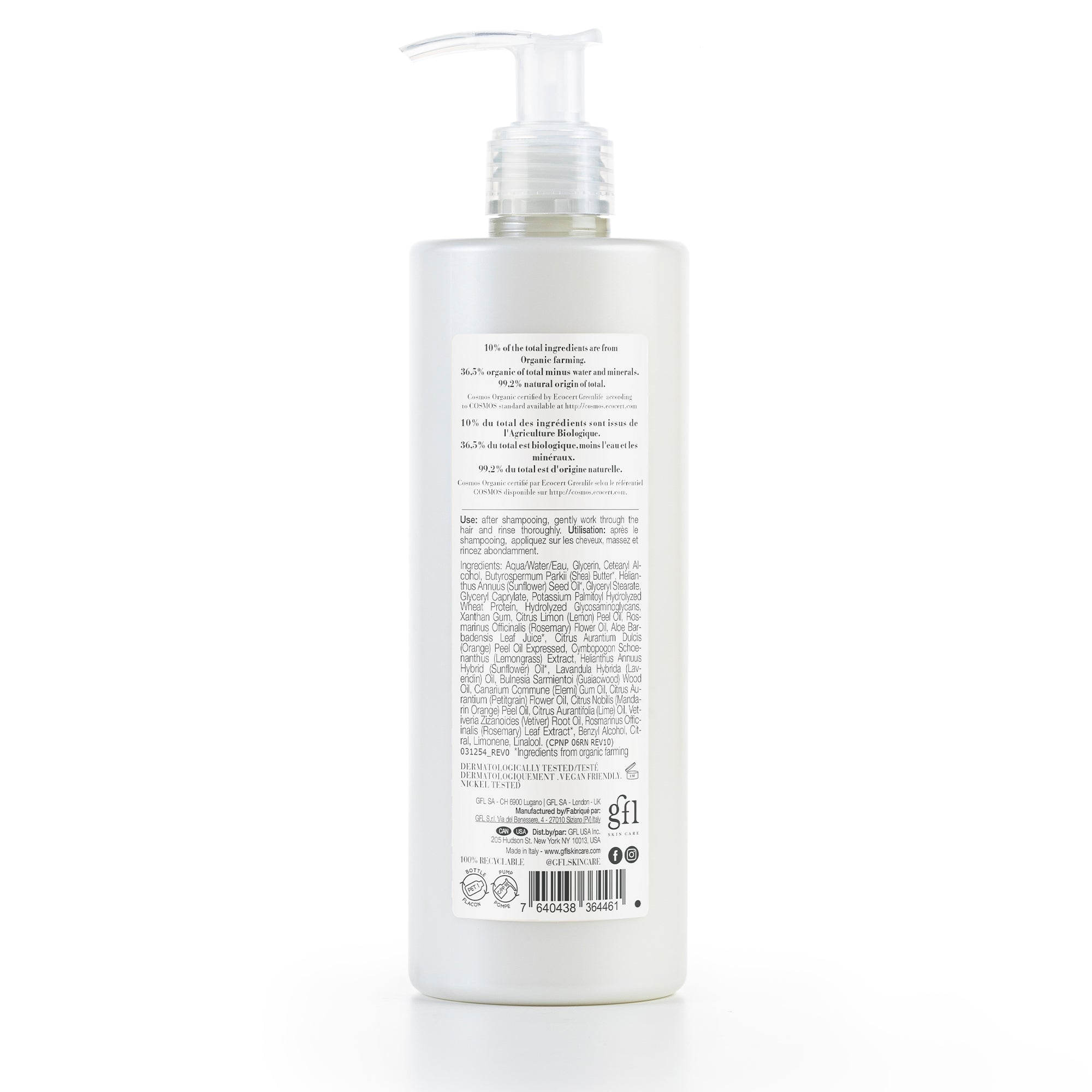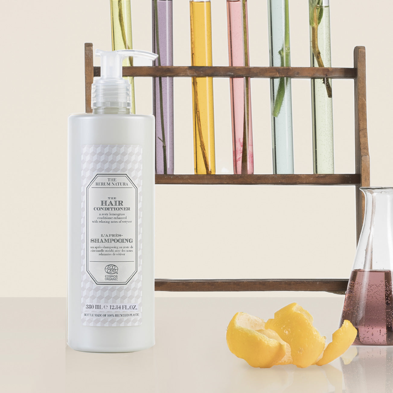 xUn après-shampooing zesté à la citronnelle, rehaussé de notes relaxantes de vétiver, certifié "Cosmos organic by Ecocert".