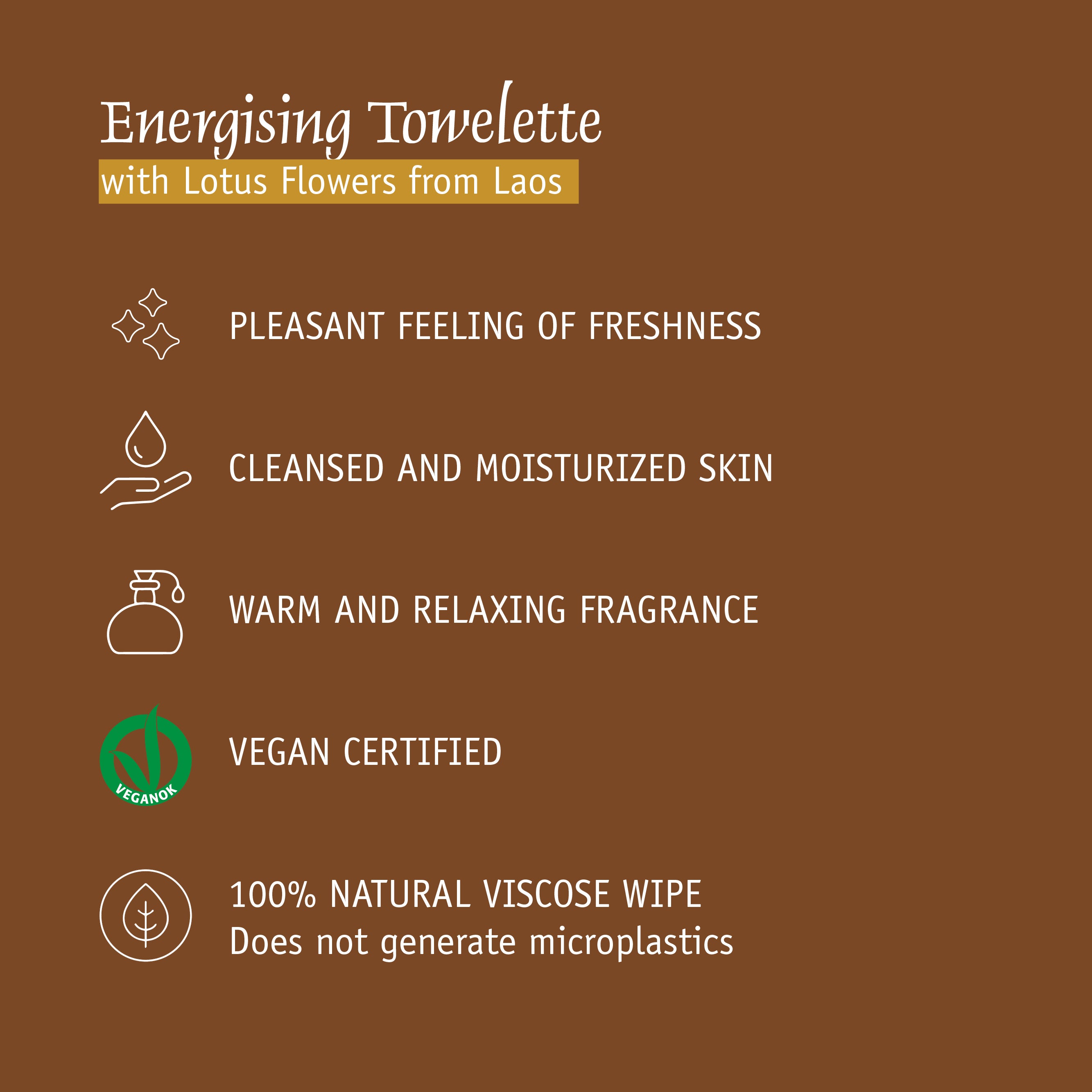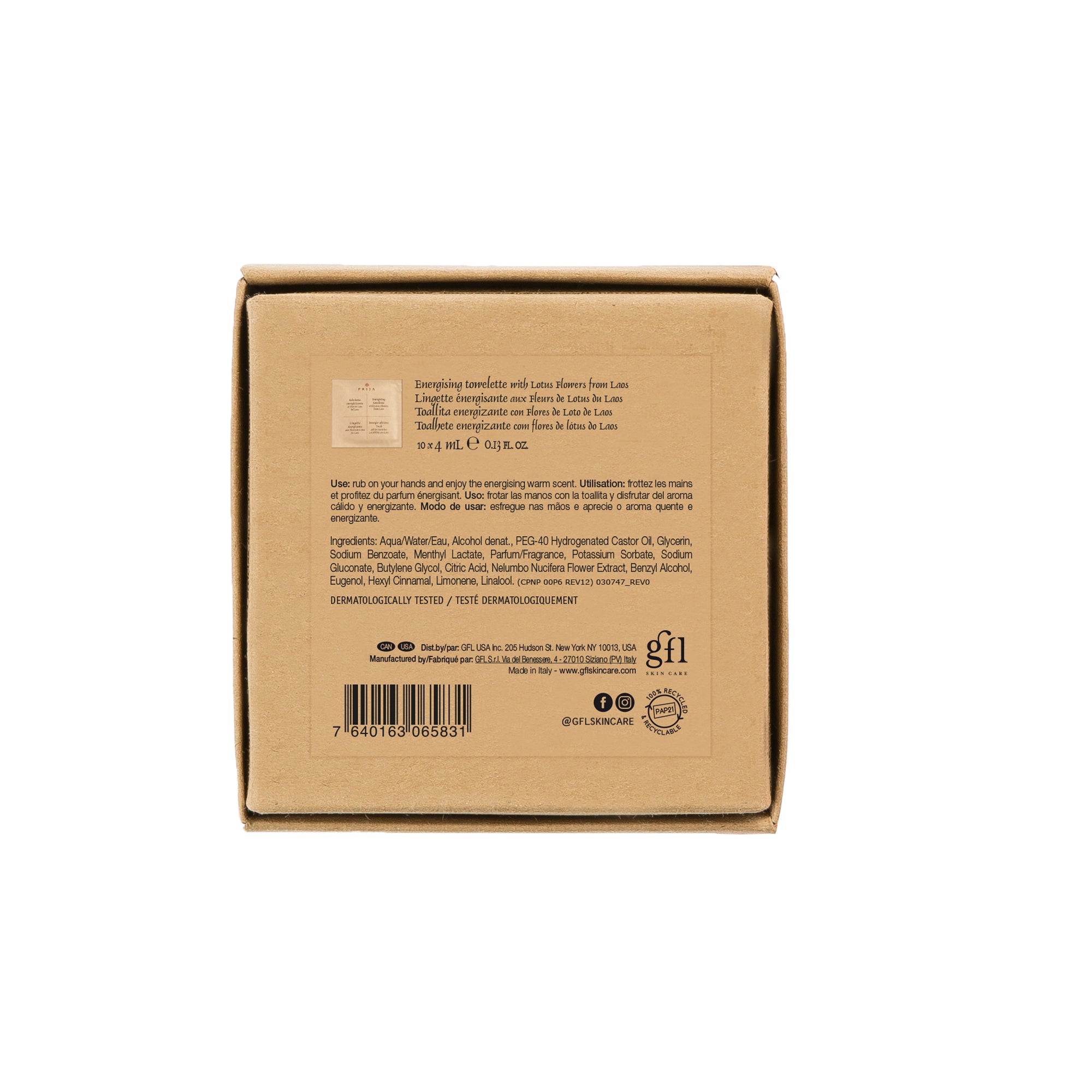 xLingettes énergisantes aux Fleurs de Lotus du Laos pour hydrater et assainir votre peau, en donnant une agréable sensation de fraîcheur. Depuis l'Antiquité, la plante de Lotus est utilisée en Orient pour ses extraits stimulants et source de bien-être. Parmi ses nombreuses particularités, elle possède également des propriétés assainissantes et hydratantes. Un parfum enveloppant qui allie force et caractère à une atmosphère chaleureuse et relaxante.